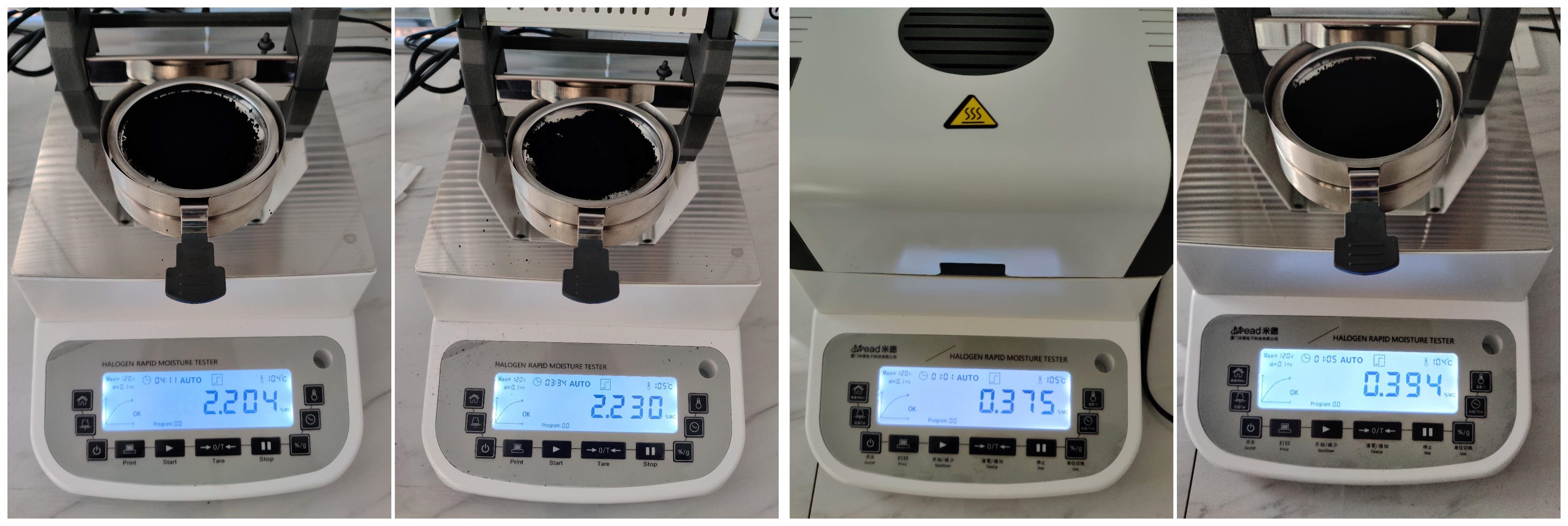 • 用樣品勺取適量充分暴露在空氣中的碳黑粉末均勻鋪在樣品盤上,設置好合適的溫度后蓋下上蓋,按下“START”鍵開始測試;蜂鳴兩聲后,儀器自動停機,測試結束,可在液晶顯示屏查看被測粉體的水分含量為2.204%;